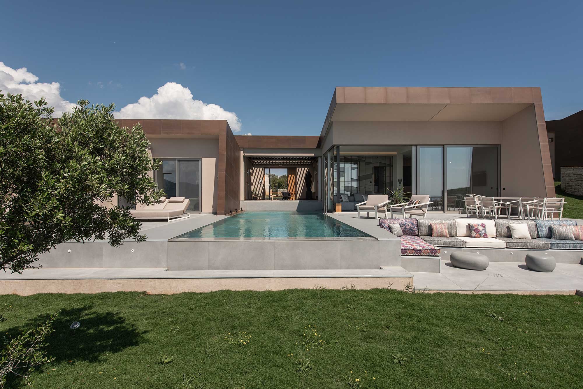 Thalatta villa combines the traditional Greek architecture with a contemporary twist. It has a modern style with wooden elements and boho – chic details. Large window walls embrace the sunlight and offer uninterrupted views of the sea and the blue sky. The impressively spacious terrace of the villa includes many lounge and sitting areas especially designed to facilitate the connection with the surrounding natural landscape. Start your day by admiring the unobstructed view of the stunning blue of the sea and sky from the comfort of your bed.